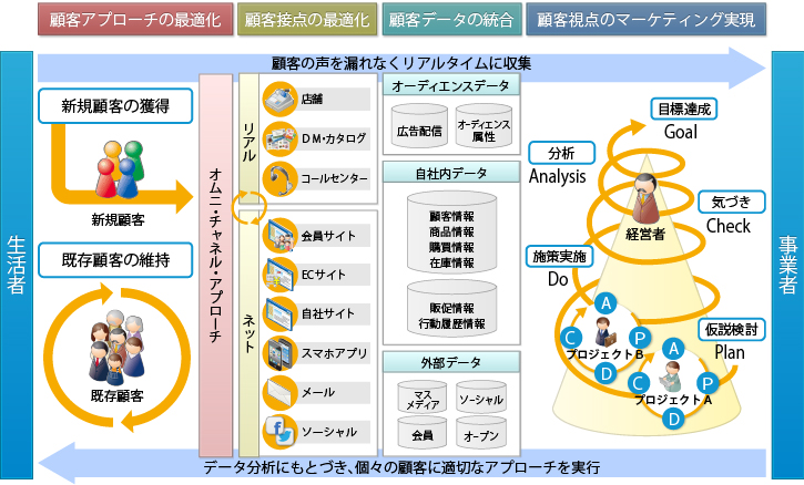 CRMは、顧客の個人情報や顧客との接点、購入履歴、購入前の行動を把握することが可能です。BtoB商材であれば、顧客の属する企業の情報も登録し管理できます。 分析系の機能では、集約されたデータをRFM(Recency/Frequency/Monetary)分析だけでなく、アンケートのテキストマイニングなど、多角的な分析に活用できます。マーケティング担当者や営業マネージャー、経営者は「営業の見える化」とあわせてリアルタイムに分析を進めることで迅速な判断が下せます。分析系の機能は、広義のBI(ビジネスインテリジェンス)ツールの機能と捉えることができるでしょう。