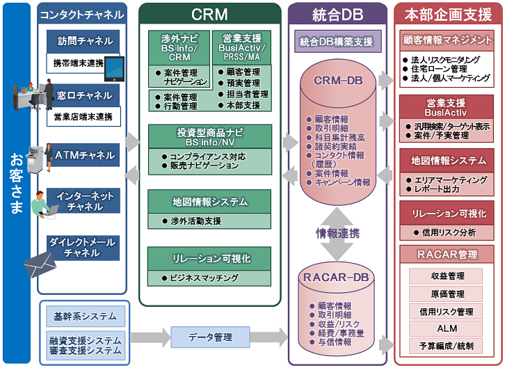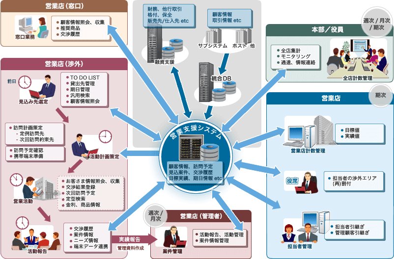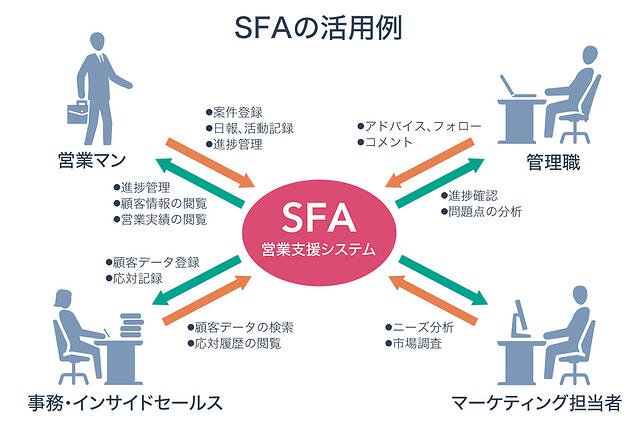 既存顧客や見込顧客のそれぞれについて、営業活動に関連する情報を記録・管理することができ、過去の商談の履歴や、現在進行中の案件の進捗状況、営業活動を通じて入手した重要な情報、アポイントメントや期限といったスケジュールなどを一覧したり編集することができる。 SFAをチームで利用することによりチーム内で常に最新の状況を共有することができ、属人性を排して組織として効率的に営業業務を進めることができる。 既存顧客との関係を管理する情報システムやソフトウェアをCRM(Customer Relationship Management)というが、多くの企業では既存顧客への営業も重要な営業活動であるため、CRMがSFAの機能を取り込んだり、SFAにCRMとしての機能が追加される事例が増えており、両者の融合が進みつつある。